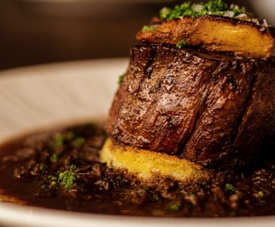 Esse diálogo aparece, por exemplo, no T-bone grelhado com legumes à toscana, servido com abobrinha, abóbora cabotiá, vagem, couve-de-bruxelas, tomates assados no azeite, brócolis e redução de balsâmico — um prato expressivo, mas solar, pensado para compartilhar. Em contraponto, o Filet Rossini assume a face mais profunda da herança francesa, com molho rôti, batatas fondant e finalização com foie gras e brioche tostado, construindo intensidade e untuosidade sem excessos.