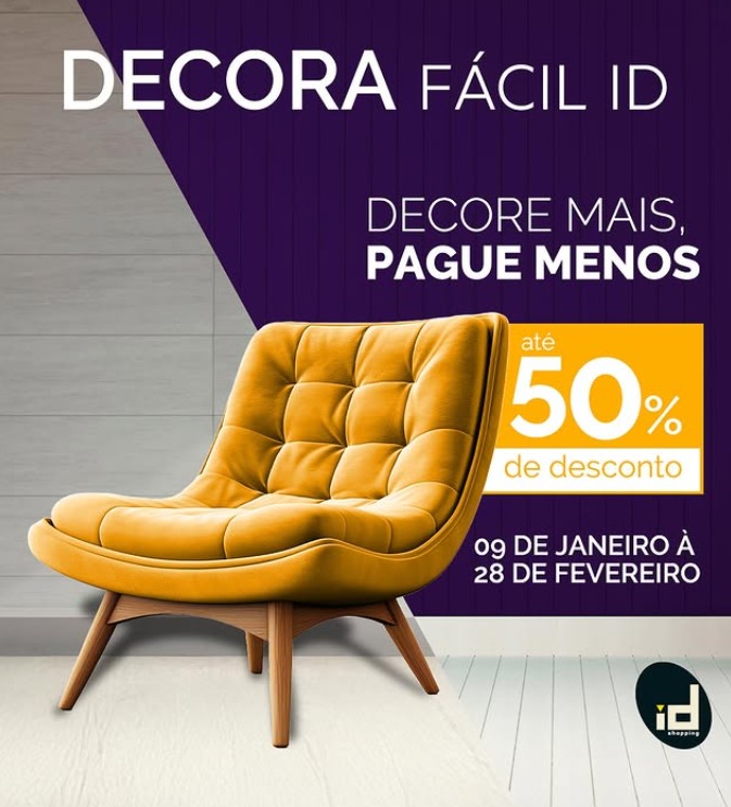 A Decora Fácil 2025 está imperdível! Até o dia 28 de fevereiro, as lojas do ID estarão com descontos de até 50% em uma ampla seleção de produtos, como sofás, móveis planejados, objetos decorativos e muito mais. Além das promoções, a campanha traz inspirações de projetos DIY (Faça Você Mesmo) para que os clientes consigam dar um toque pessoal à decoração dos lares.