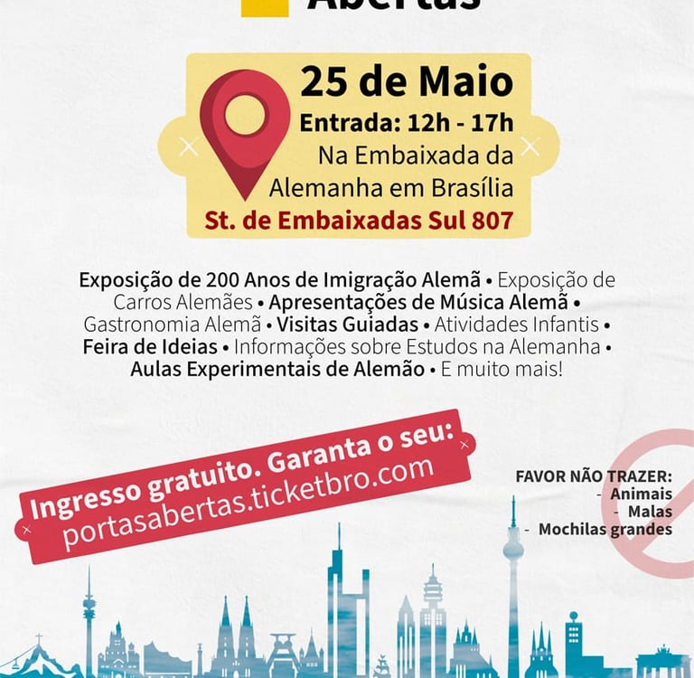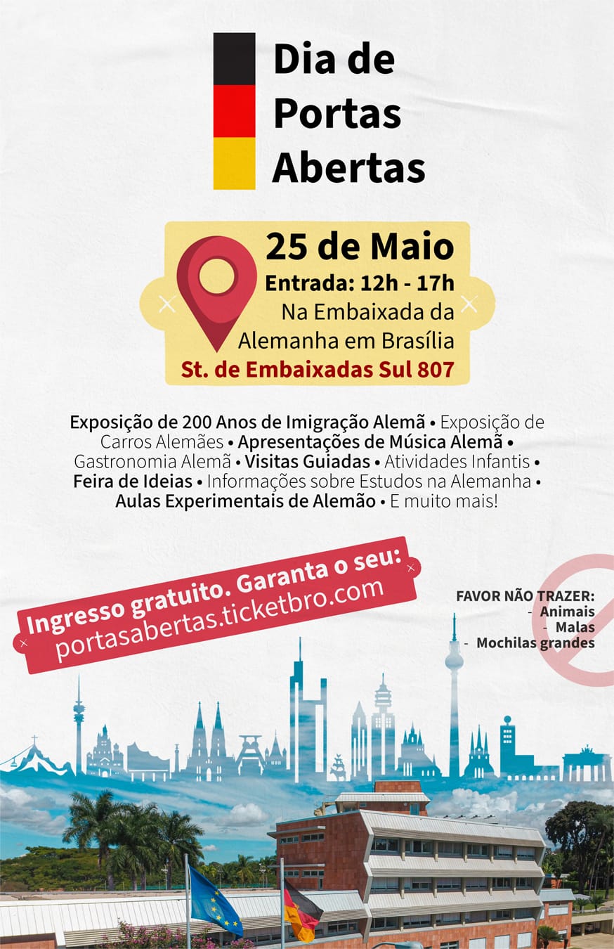 A Embaixada da Alemanha realizará no dia 25 de maio um Dia de Portas Abertas. O evento gratuito iniciará às 12h e fará parte das comemorações dos 200 anos da imigração alemã no país.