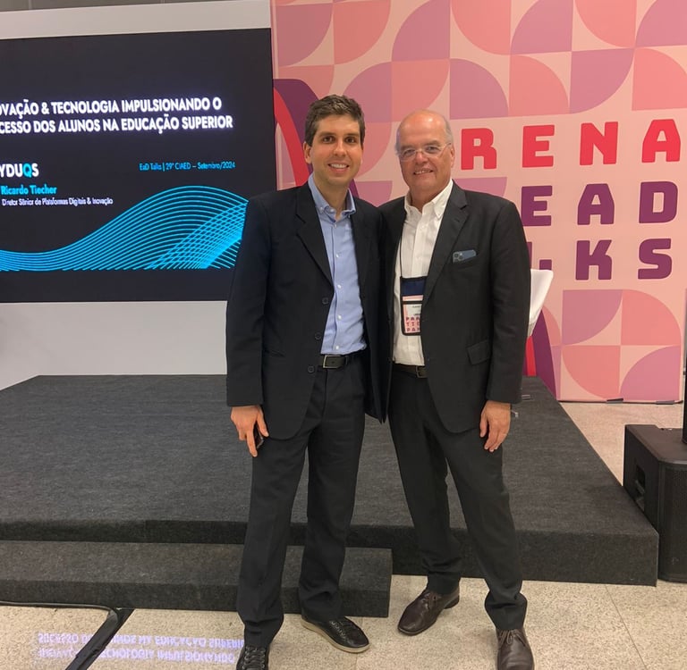 Ricardo Tiecher, diretor de Inovação & Produtos Digitais da Estácio, contribuiu para o evento com a palestra “Impulsionando o sucesso dos alunos com inovação e tecnologia”, realizada no dia 16 de setembro. Tiecher destacou como a tecnologia e a inovação são fundamentais para personalizar a jornada educacional e melhorar o desempenho acadêmico e a inclusão digital. Já o diretor de Ensino da Estácio, Flavio Murilo, participou do evento com duas oportunidades. No dia 17 de setembro, Murilo integrou o painel "Qualidade na Educação a Distância em Escala: a visão dos grandes grupos”, coordenado por Carlos Roberto Juliano Longo (ABED), e que também contou com representantes de outras grandes instituições de ensino, como Beatriz Maria Eckert Hoff (Cruzeiro do Sul Virtual), Fabrício Ricardo Lazilha (Vitru), Juliano Griebeler (Cogna) e Rodrigo Berté (Uninter). No dia 18, Flavio apresentou sobre o tema: “O que o ensino presencial aprendeu com a EaD?”, destacando que um Ensino Digital com qualidade atestada, pode promover uma aprendizagem acessível e transformadora para todos para alunos, independente da modalidade de ensino.