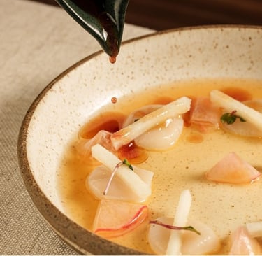 Cada elemento é pensado como parte de uma narrativa sensorial: técnica japonesa, ingredientes brasileiros, referências globais — unidos por um gesto autoral que privilegia leveza e precisão.