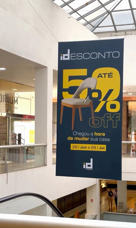 Contagem regressiva para o fim da Campanha IDesconto no Shopping ID: até 28 de julho, você pode renovar sua casa com até 50% de desconto. Vários produtos entre sofás, móveis planejados, objetos decorativos, utensílios do lar, entre outros estão expostos nos corredores do shopping.