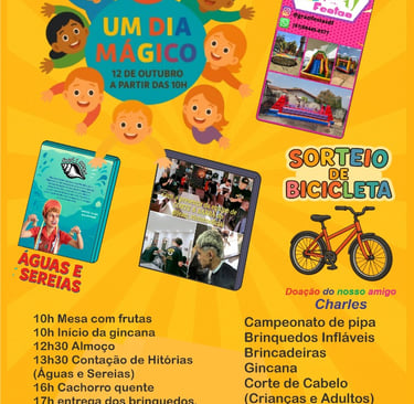 Contação de histórias, campeonato de pipa, brinquedos infláveis, gincanas com premiação, brincadeiras para todas as idades, além de um almoço e lanche comunitário, são algumas das atrações do 1º Dia das Crianças da Vila Cultural . Para fechar a festa com chave de ouro, haverá o sorteio de uma bicicleta, presenteando um pequeno grande sortudo.